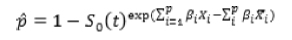 Donde S0(t) es la sobrevida al tiempo de seguimiento considerado; βi son los coeficientes de regresión estimados (Log hazard ratio); Xi es el valor específico de cada uno de los factores de riesgo considerados por la ecuación, Xi se refiere a los valores promedios de cada uno de los factores de riesgo en la población basal de CESCAS y p se corresponde con el número de factores de riesgo de cada una de las ecuaciones.