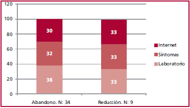En el seguimiento al año [mediana: 9 meses, (RIC 25-75%) 7-11,5 meses] solo el 50% (n: 104) de los pacientes continuaba tomando estatinas en alta intensidad, un 28% (n: 54) habían reducido la dosis e, incluso, un 22% (n: 40) había abandonado el tratamiento. Los motivos de suspensión/reducción fueron por indicación médica en un 53% y por iniciativa propia del paciente en el 47% de los casos (Tabla 2). En los pacientes que redujeron o suspendieron el tratamiento por su propia decisión (n: 43), la información obtenida por los pacientes mediante internet fue la responsable de su decisión en más de un tercio de los casos (Figura 1).
