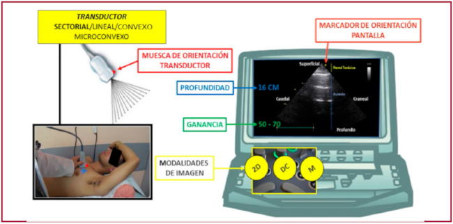 El cardiólogo puede utilizar el mismo transductor de ecocardiografía, con la misma orientación y especificaciones de la pantalla. Para la exploración, cada hemitórax se divide en 6 regiones. Utilizando de referencia las líneas axilar anterior y posterior, se determinan las regiones anteriores, laterales y posteriores y, utilizando la línea mamilar y subescapular, las regiones superiores e inferiores. El transductor se coloca perpendicular al tórax con la muesca de orientación hacia la cabeza (abordaje longitudinal). De esta manera las estructuras superficiales se localizan en la parte superior de la pantalla y las craneales en la parte derecha. 8 (Figura 1)