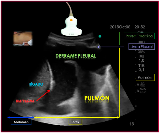 Corresponde al 100% de fluido en el espacio subpleural. Se identifica por la presencia de un área de ecogenicidad variable, generalmente anecoica (Figura 4). Para su evaluación se deben explorar las áreas más declives del tórax en las que referencias anatómicas, como hígado o bazo, sirven de ventana acústica. Una vez localizado estos órganos sólidos, se identifica su borde hiperecogénico craneal (diafragma) y todo lo que se encuentre cefálico a este corresponde al tórax. Una vez ubicado el tórax, el área anecoica, constituye el marcador ecográfico del patrón de derrame pleural (DP). En ecografía, el DP debe clasificarse y cuantificarse. La clasificación se basa en la presencia de imágenes ecogénicas en el interior del derrame. Si están ausentes se clasifica como simple, indicativo generalmente de transudado, y, si están presentes (puntos ecogénicos, tabiques) se clasifica como complejo, indicativo de exudado con certeza del 100%. 11 Para la cuantificación hay diversas fórmulas en sedestación y decúbito supino, todas imprecisas, sin embargo dan una idea de la cantidad y permiten su seguimiento. Una de las más prácticas es la de Balik, se realiza en decúbito supino, a 15°, en espiración, midiendo el diámetro mayor en el espacio interpleural en milímetros y multiplicando por 20 para obtener la cantidad de mililitros aproximados. 12