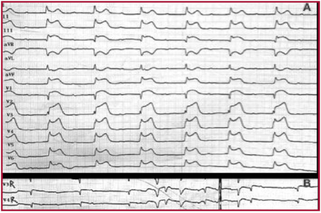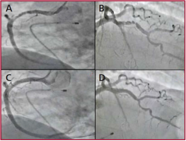 Presentamos el caso de un hombre de 68 años con antecedentes de tabaquismo y diabetes mellitus tipo 2, sin otro antecedente personal o familiar de enfermedades, quien fue atendido en el servicio de urgencias por un episodio de una hora con dolor torácico, disnea y diaforesis. Al examinarlo, presentaba frecuencia cardíaca de 40 latidos por minuto (lpm) y presión arterial media de 70 mmHg. Se encontraba nervioso; la auscultación reveló bradicardia con ruidos respiratorios normales, el resto del examen fue normal. El electrocardiograma (ECG) inicial mostró una lesión subepicárdica en la pared anterior e inferior con compromiso del ventrículo derecho (VD), y un bloqueo atrioventricular (AV) de 3.o grado (Figura 1). El paciente recibió tratamiento con aspirina 300 mg, clopidogrel 300 mg, enoxaparina 30 mg y un único bolo de tenecteplasa ajustado por peso dentro de los primeros 15 minutos del diagnóstico de infarto de miocardio. Sin embargo, el paciente desarrolló shock cardiogénico y el ECG no mostró ningún criterio de reperfusión 60 minutos después de la trombólisis. En ese momento, los indicadores de riesgo del IMEST fueron GRACE 181 puntos (40% de probabilidad de muerte desde el ingreso hasta los 6 meses) y TIMI 9 puntos (35,9% de riesgo de mortalidad por cualquier causa a los 30 días). El paciente fue entonces trasladado a la unidad de cateterismo cardíaco para someterlo a una angioplastía de rescate con soporte de norepinefrina y dobutamina. En primer lugar, se colocó un electrodo de marcapasos en el ventrículo derecho a través de la vena femoral y se programó en modo VVI con una frecuencia de 70 lpm; la angiografía coronaria mostró trombo intraluminal y un 70% de estenosis en el segmento proximal de la arteria coronaria derecha (CD) con flujo TIMI 2. Simultáneamente, la arteria descendente anterior (DA) izquierda mostró trombo intraluminal y estenosis del 80% en el segmento medio con flujo TIMI 2. Se implantó un stent liberador de everolimus (Xience-Alpine: 4,0 × 28 mm) en la CD y dos stents liberadores de everolimus (Xience-Alpine: 3,5 × 18 mm y 4,0 × 18 mm) se implantaron en la DA con superposición de stents. La última angiografía mostró las dos arterias con flujo TIMI grado 3 (Figura 2). Posteriormente, el ECG mostró un ritmo sinusal normal y marcadores de reperfusión con normalización del segmento ST de las inversiones del segmento ST y de la onda T en las derivaciones afectadas. El ecocardiograma reveló discinesia del VD con un cambio del área fraccional del 22% y fracción de eyección del ventrículo izquierdo del 46%. El soporte inotrópico y los vasopresores fueron suspendidos en menos de 48 horas. Tras la rehabilitación cardíaca en el hospital, el paciente finalmente fue dado de alta 8 días más tarde con seguimiento médico en los consultorios externos de cardiología. En la última consulta cardiológica, seis meses después del evento, el paciente manifiesta no tener síntomas cardiovasculares en sus actividades diarias ni tampoco durante los ejercicios aeróbicos, por lo que su afección tiene una clase funcional I según la New York Heart Association.