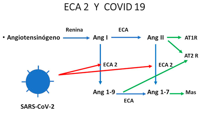 La puerta de entrada del SARS-CoV-2 en el organismo es la enzima convertidora de la angiotensina 2 (ECA2). (Figura 1) La infección es causada por la unión de la proteína S del virus, activada por una serina 2 proteasa transmembrana (TMPRSS2), con el receptor de la ECA2. 22