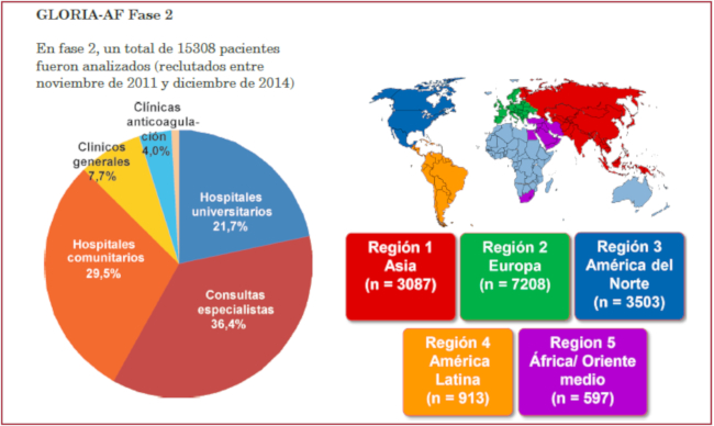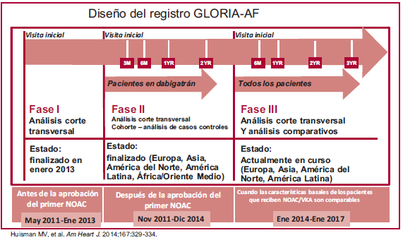 Introducción: El GLORIA-AF (Global Registry on Long-Term Oral Antithrombotic Treatment in Patients with Atrial Fibrillation) es un registro internacional, prospectivo, en tres fases, para determinar la seguridad y eficacia del dabigatrán en pacientes con fibrilación auricular no valvular recientemente diagnosticada, en riesgo de stroke. La fase II empezó cuando el dabigatrán, el primer anticoagulante oral no antagonista de la vitamina K (NOAC) estuvo disponible.