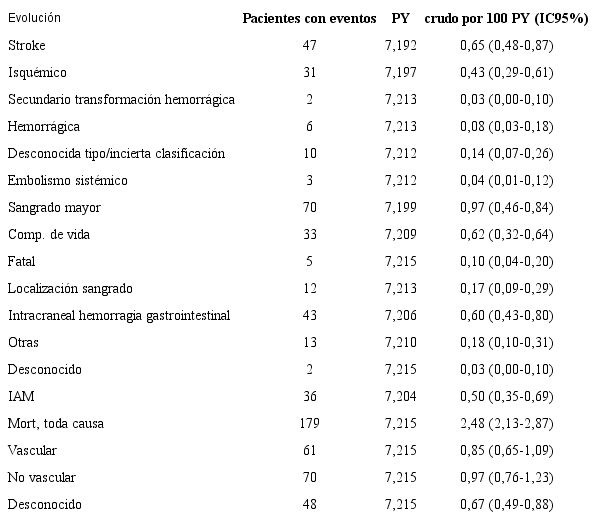Los hallazgos clínicos en el seguimiento son reseñados en la Tabla 1. El 94% (4580/4873) de los pacientes no presentó ningún hallazgo de interés (stroke, sangrado mayor, IM y muerte de cualquier causa) durante el seguimiento. La tasa de incidencia de stroke fue de 0,65 (IC95%: 0,48-0,87) por 100 personas-año (70% fueron isquémicos, 12,8 fueron clasificados como primariamente hemorrágicos y el 4,3% como secundario a transformación hemorrágica); la tasa de incidencia de sangrado mayor fue de 0,97 (IC95%: 0,76-1,23) por 100 personas-año ; la de sangrado que compromete la vida (principalmente gastrointestinal y, menos frecuentemente, intracraneal) fue de 0,62 (IC95%: 0,46-0,84) por 100 personas-año y la de sangrado fatal fue de 0,10 (IC95%: 0,04-0,20) por 100 personas-año. La tasa de incidencia de IM, muerte vascular y muerte de cualquier causa fue de 0,50 (IC95%: 0,35-0,69); 0,85 (IC95%: 0,65-1,09) y 2,48 (IC95%: 2,13-2,87), respectivamente.