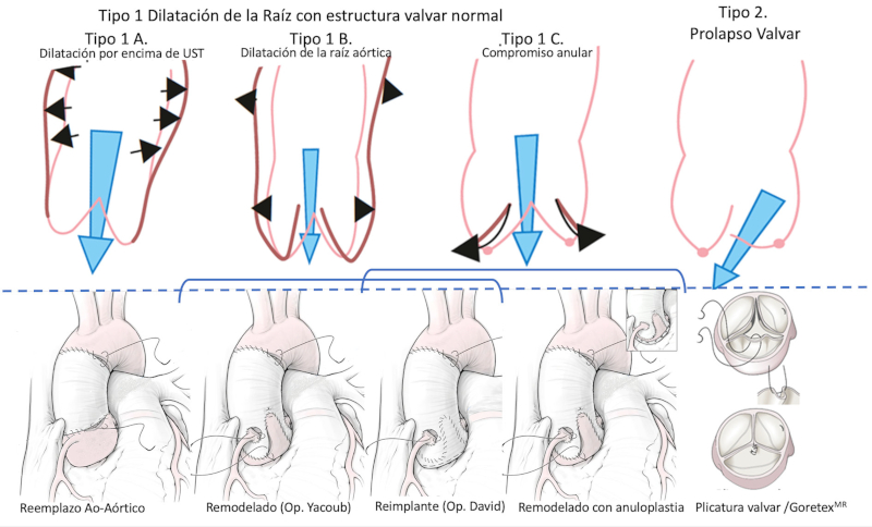 En 2005, nuestra institución inició un programa de preservación valvular que ha evolucionado al punto de constituir la primera elección en pacientes con enfermedad aneurismática, en ausencia de degeneración o estenosis valvular. El objetivo de esta presentación es revisar la clasificación fisiopatológica y los criterios de selección de los pacientes, así como reportar los resultados a corto y largo plazo, en términos de recurrencia de insuficiencia valvular y reintervención, a fin de promover su utilización, extensamente recomendada, pero escasamente aplicada.4,5