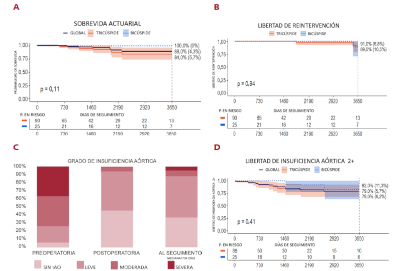 La morbimortalidad perioperatoria se determinó siguiendo definiciones convencionales (Apéndice 1). Todos los pacientes fueron evaluados por ecocardiografía al alta, y seguidos por la clínica de valvulopatías; esa evaluación clínica y ecocardiográfica fue repetida a los 3, 6 y 12 meses y, anualmente, asociando AngioTC. Ante sospecha clínica de endocarditis, aumento de gradientes o progresión de IAO, se indicó ETE. En la evaluación de curvas de sobrevida y reincidencia de insuficiencia significativa, se consideró la variante valvular (bicúspide o tricúspide), asociada al resultado dispar en publicaciones previas.