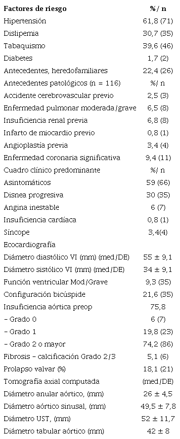 La mediana de edad fue de 56 ± 15,6 años (rango 1878), 73% de sexo masculino, superficie corporal 1,99 ± 0,2 m2. Las características basales se muestran en la Tabla 1. La principal indicación de intervención fue el diámetro aórtico indexado, su progresión o antecedentes heredofamiliares. Un escaso 10,3% fue categorizado como síndrome de Marfan o Loeys Dietz.