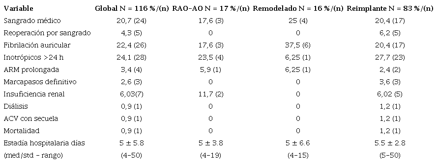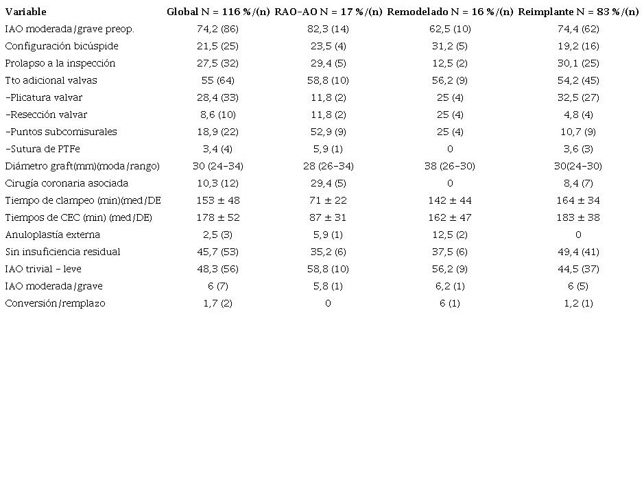Otras variables técnicas se modificaron a lo largo de la serie, con un abandono precoz de la resuspensión con puntos subcomisurales o las suturas de Goretex® sobre bordes libres. Discontinuada la circulación extracorpórea, por ETE se reportó un 94% de pacientes sin IAO residual significativa, y 7 casos (6%) de IAO de moderada a grave, con una tasa de conversión a remplazo del 1,7% (2 casos). En los 5 casos restantes (4,3%) se toleró insuficiencia residual moderada, en contexto etario, CEC prolongada y comorbilidad asociada, todos ellos intervenidos en los primeros 5 años del programa. Los datos intraoperatorios y los resultados están resumidos en la Tabla 2.