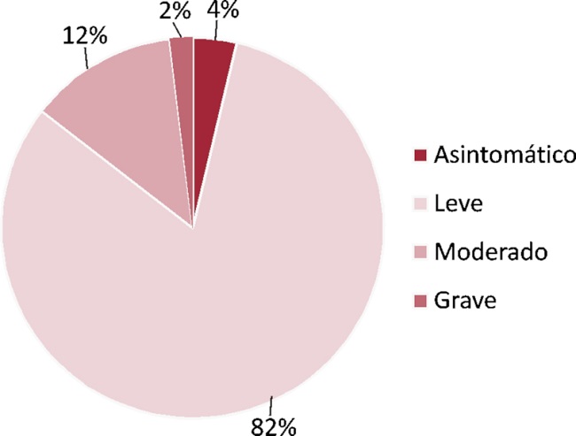 Respecto al cuadro agudo de COVID-19, el 3,7% de los pacientes cursó asintomático, 81,8% presentó cuadros leves, 12,6% moderados, y 1,9% graves, con sólo 0,6% con requerimiento de ARM (Figura 1).