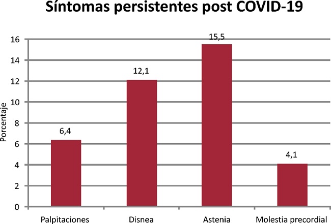 Al momento de su inclusión, el 28,6% de los pacientes refería síntomas persistentes, presentando palpitaciones el 6,4%, disnea el 12,1%, astenia el 15,5% y molestia precordial el 4%. (Figura 2). No hubo asociación entre la persistencia de síntomas en la etapa de convalecencia y los hallazgos ecocardiográficos patológicos (Tabla 3).