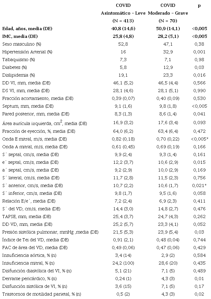 Los pacientes con cuadros agudos de COVID-19 moderados-graves presentaron más trastornos de la motilidad parietal (4,3 % versus 0,5%, p = 0,02) y más derrame pericárdico (4,3 % versus 0,24 %, p = 0,01). En el análisis multivariado, ajustando por edad y factores de riesgo cardiovascular (diabetes, dislipidemia, hipertensión arterial e índice de masa corporal), esta diferencia perdió significancia estadística. No hubo diferencias en la función sistólica ventricular izquierda evaluada por FEVI ni en el análisis de la velocidad tisular sistólica como subrogante de disfunción de fibra, entre cuadros agudos moderados-graves versus leves-asintomáticos; únicamente la pared anterior mostró una velocidad de onda S´ menor en los pacientes que cursaron cuadros moderados-graves que, si bien alcanzó significación estadística, podría no tener relevancia clínica dado que el valor se encuentra dentro de parámetros normales. (Tabla 2).