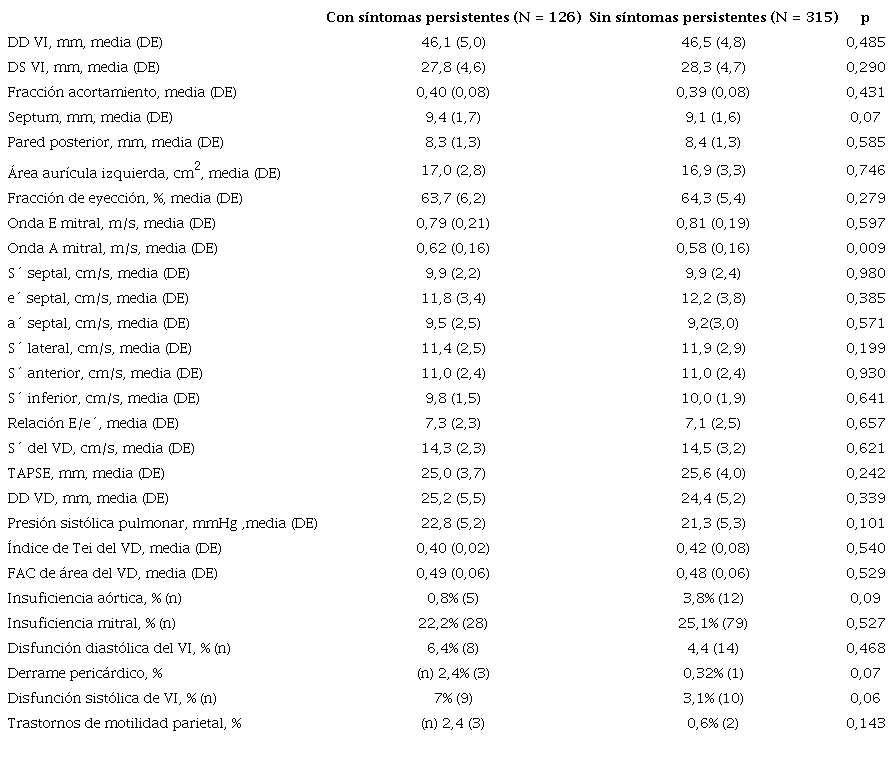 Methods: An analytical, observational, prospective and single-center study was carried out, including consecutive patients attending the center for post-COVID-19 evaluation who underwent a transthoracic color Doppler echocardiogram looking for pathological outcomes.