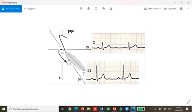 Ejemplos de electrocardiogramas se observan en las Figura 1 y 2. Ambas Figuras, con patologías diferentes (bloqueo de rama izquierda e hipertrofia ventricular izquierda), muestran claramente que DI presenta infradesnivel descendente del ST, que no registra V6. La Figura 3 representa la descripción vectorial del plano frontal de la RV normal en forma esquemática, que explica el registro electrocardiográfico de la misma, como puede observarse en las derivaciones DI y DII: en condiciones normales los tres vectores de la RV tienen la misma dirección vectorial (inferior e izquierda), por lo tanto, el punto J se registrará positivo, el segmento ST ascendente y la onda T positiva en ambas derivaciones.