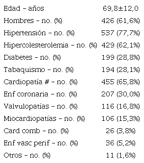 Los datos demográficos y los motivos de consulta con los diagnósticos de cada paciente están resumidos en la Tabla 1. La mayoría fueron pacientes añosos y de sexo masculino. En 189 casos (27,4%) el motivo de consulta resultó la presencia de FR, mientras que el 65,8% (455 pacientes) era portador de algún tipo de cardiopatía (coronaria, valvular, miocardiopatía, o mixta). Un pequeño porcentaje (5,2%) presentó enfermedad vascular (periférica, aórtica o cerebral) u otra enfermedad (1,6%), sin evidencia concluyente de cardiopatía asociada, aunque eran portadores de FR.