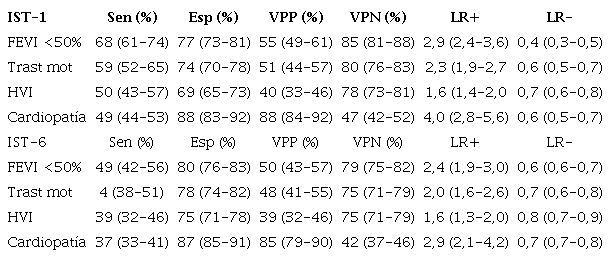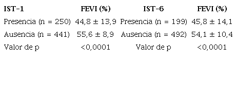 Resultados: Se analizaron en forma prospectiva 691 pacientes, edad media 69,8 ± 12 años, 61,6% hombres. Se identificó IST-1 e IST-6 en 250 (36,2%) y 199 (28,8%) casos, respectivamente. La presencia de IST-1 e IST-6 se asoció a una FEVI significativamente menor comparado con la ausencia de dicho hallazgo: 44,8 ± 13,9% vs. 55,6 ± 8,9%, (p <0,0001) y 45,8 ± 14,1% vs. 54,1 ± 10,4% (p <0,0001) respectivamente. Ambos se asociaron a la presencia de DSVI, definida como FEVI <50%, aunque el IST-1 mostró mejor rendimiento diagnóstico que el IST-6 [área bajo la curva 0,72 (IC 95% 0,69-0,76) vs. 0,64 (IC 95% 0,610,68), p = 0,0001].