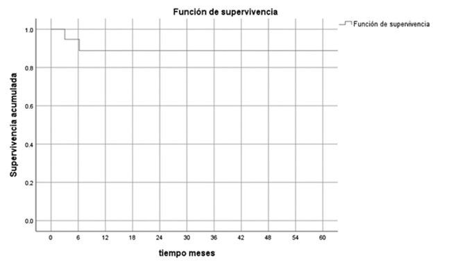 La tasa de supervivencia en ECMO VA fue del 63%, 37% como puente al trasplante cardíaco y 26% a la recuperación. La sobrevida al alta hospitalaria fue del 42,6%. En aquellos pacientes dados de alta, con una mediana de seguimiento de 22 meses (RIC 6-30), se constató una sobrevida del 90%. (Figura 2)