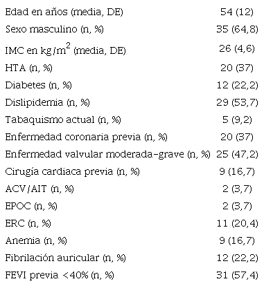Respecto a las características basales, la edad media fue de 54 ± 12 años, y el 64,8% de la población era de sexo masculino. Se observó un 22,2% de pacientes diabéticos, 37% con antecedentes de enfermedad coronaria previa, 47,2% enfermedad valvular, y 20,4% enfermedad renal crónica. (Tabla 1)