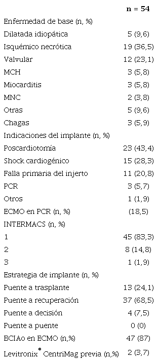 Results: A total age 54 patients were included (54 ± 12 years), 36.5% presented ischemic cardiomyopathy and 23.1% significant valvular heart disease. The indications for VA-ECMO implantation were post-cardiotomy (43.4%), refractory CS (28.3%) and primary graft dysfunction (20.8%). Cardiopulmonary resuscitation before VA-ECMO occurred in 18.5% of the cases. Peripheral cannulation was performed in 81.5% of the cases, 83.3% had INTERMACS profile 1 and 87% were on intraaortic balloon pump. Duration of ventricular assistance on VA- ECMO was 5.5 days (IQR 2.8-10). Survival rate on ECMO VA was 63% (37% as a bridge to cardiac transplantation and 26% as a bridge to recovery) and survival to discharge was 42.6%. The most common complications were hemorrhage (61.1%), infections (51.9%), and thromboembolic complications (46.3%).