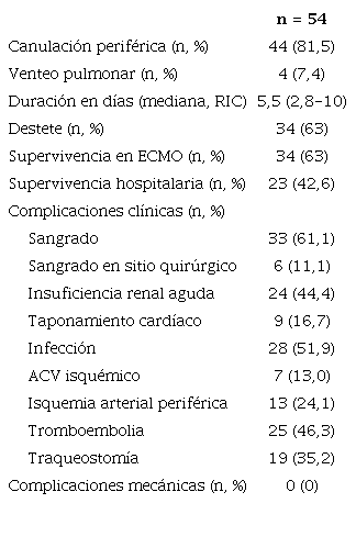 Las complicaciones más frecuentes durante la asistencia en ECMO VA fueron: sangrados (61,1%), infecciones (51,9%), complicaciones tromboembólicas (46,3%), insuficiencia renal aguda (44,4%), y ventilación mecánica prolongada con requerimiento de traqueostomía (35,2%). (Tabla 3)