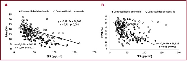 Evaluación de la contractilidad: De los 184 pacientes, 64 (35%) tuvieron contractilidad disminuida (NC <0) y 120 (65%) contractilidad conservada (NC ≥0). Al considerar los grupos según la FEVI, el 49% (51/105) de los pacientes con FEVI <60% tuvieron contractilidad disminuida, siendo estadísticamente significativa la diferencia al compararlos con los pacientes con FEVI ≥60% (50% (FEVI <50%) y 44% (FEVI 50-59%) vs 13% (FEVI 60-69%) y 26% (FEVI ≥70%) respectivamente, p<0,01) (Tabla 2). La FAm se correlacionó inversamente con el EFS tanto en los pacientes con contractilidad conservada como disminuida, siendo las dos rectas de regresión paralelas entre sí, pero difiriendo en el valor de intersección del eje Y (FAm 25% vs 16%, p <0,001) (Fig. 1A). Al dividir los pacientes de cada grupo en NC <0 y NC ≥0 se observó que a pesar de no haber diferencias significativas en los valores de FEVI y de EFS dentro de cada grupo, la FAm estuvo significativamente disminuida en todos los pacientes con NC <0, lo que implica que para similares valores de poscarga (EFS) la FEVI no pudo discriminar entre contractilidad deprimida o conservada (Tabla 3). El índice ∆ FEVI - NC, que evalúa la discrepancia entre la FEVI y el NC evidenció un incremento progresivo desde el grupo FEVI <50% a FEVI ≥70% (Tabla 2).