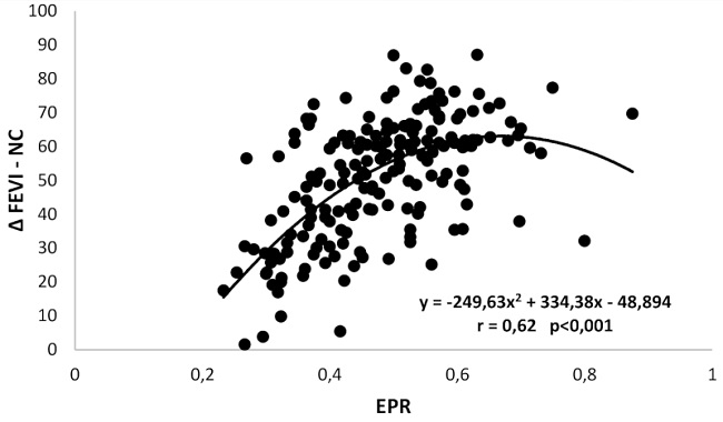 Geometría ventricular: La hipertrofia excéntrica predominó en los pacientes con FEVI < 50% mientras que la hipertrofia concéntrica fue más frecuente en el resto de los pacientes. El índice ∆ FEVI-NC tuvo una correlación logarítmica con el EPR (Figura 2) observándose un incremento de ∆ FE - NC hasta un EPR de 0,65 luego del cual muestra una disminución.