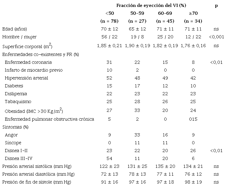 La función diastólica se evaluó mediante la relación E/A, relación E/é, índice de volumen de la aurícula izquierda y presión sistólica de la arteria pulmonar. Los pacientes con EAo fueron divididos en 4 grupos: FEVI < 50% (n = 78), FEVI 5059% (n = 27), FEVI 60-69% (n = 45) y FEVI ≥70% (n = 34).