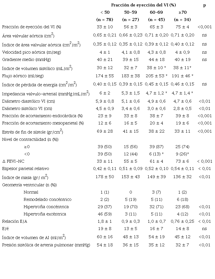 De acuerdo con nuestros hallazgos y el de otros autores, se debería reconsiderar el límite de FEVI deprimida en la EAo, probablemente a 60% teniendo en cuenta que, de todas formas, 1 de cada 4 pacientes con valores superiores a 60% podrían tener contractilidad disminuida. Se requieren más estudios para determinar el valor pronóstico que tiene la contractilidad disminuida con FEVI preservada.