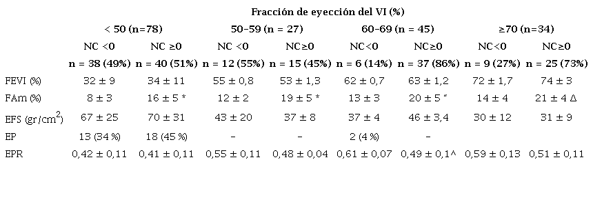 Poscarga (EFS): En el total de los 184 pacientes, la FEVI tuvo correlación inversa con el EFS solo en los pacientes con contractilidad disminuida y no en los pacientes con contractilidad conservada (Fig. 1B) a diferencia de los observado en la relación FAm - EFS. En el grupo FEVI < 50%, el exceso de poscarga (EFS >77 gr/cm2) estuvo presente en 13 (34%) de los 38 pacientes con NC <0 y en 18 (45%) de los 40 pacientes con NC ≥0 (Tabla 3). Esto implica que la causa de la FEVI <50% fue en el 23% (18/78) el exceso de poscarga, en el 32% (25/78) contractilidad disminuida y en el 17% (13/78) exceso de poscarga y contractilidad disminuida, quedando un 28% en el cual la disminución de la FEVI se relacionó con incremento del EFS (promedio 69 ± 28 gr/cm2), pero menor que el límite considerado exceso de poscarga. En el resto de los grupos solo se registró exceso de poscarga en 2 pacientes con FEVI 60-69%).