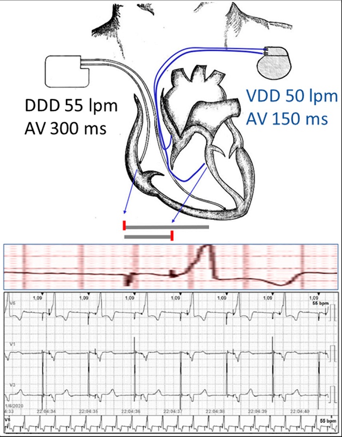Hay creciente evidencia de que la estimulación del His es equivalente a la resincronización tradicional estimulando el seno coronario 2,3. El implante fue guiado por radioscopía, el haz de His se localizó con catéter cuadripolar flectable por punción femoral derecha. Se registró el electrograma del catéter electrodo a implantar en His y un ECG de señales promediadas (ECG-SP) (Synchromax) para establecer el grado de modificación de la sincronía eléctrica. Este último es un dispositivo cuyo software adquiere, procesa y promedia las señales eléctricas cardíacas, permitiendo en tiempo real, la estimación del grado de sincronía intraventricular, comparando principalmente las derivaciones II y V6, que son las que mejor se correlacionan con la activación del septum interventricular y la pared lateral ventricular izquierda respectivamente, cuando la estimulación es generada en distintos sitios del corazón 4,5,6. En el lugar del haz de His se midieron umbrales muy altos, por lo que el catéter fue relocalizado ligeramente anterior e inferior (Figura 1 B). Se obtuvieron aceptables umbrales (2.0 V [0,5 ms]) con una reducción de la duración del QRS de 23 ms. El ECG-SP (Synchromax) mostró una correlación positiva con solo un mínimo grado de disincronía (Figura 1C). Se decidió posponer el procedimiento de extracción de los catéteres antiguos hasta lograr una mejoría de la FSVI. Seis meses después, un nuevo ecocardiograma Doppler mostró una reducción de los volúmenes auriculares y una mejoría significativa de la FSVI con una FEVI de 51%, flujo mitral de llenado ventricular izquierdo normal y los índices de sincronía fueron compatibles con leve disincronía. Poco después, la paciente presentó palpitaciones y breves episodios de disnea. Se constató la pérdida de captura del nuevo catéter auricular, con detección conservada, sin evidencia de desplazamiento. Se decidió la realización de cirugía para remover el anterior sistema de marcapasos y el reimplante del catéter auricular nuevo. Transitoriamente, el nuevo marcapasos fue programado en modo VDD con parcial mejoría. Persistieron las palpitaciones nocturnas y un nuevo Holter evidenció disincronía AV nocturna debida a la baja frecuencia auricular y frecuentes extrasistoles auriculares (5,46%). En este momento, debido a la emergencia sanitaria y las medidas adoptadas por la pandemia de COVID-19, tanto la paciente como el médico tratante solicitaron posponer la intervención. Dado que la batería del antiguo sistema de marcapasos tenía una vida útil de dos años, se decidió aprovechar esta ventaja temporariamente para mantener la frecuencia cardíaca y simultáneamente la sincronía AV. Por lo tanto, se lo programó en modo DDD a 55 lpm con un intervalo AV de 300 ms, mientras que el nuevo sistema fue reprogramado en modo VDD a 50 lpm para sensar la actividad auricular tanto espontánea como la generada por el anterior sistema, con un intervalo AV de 150 ms para conservar la estimulación para-Hisiana (Figura 2). La paciente presentó una inmediata mejoría clínica y un nuevo registro Holter mostró adecuada sincronía AV y ausencia de actividad ectópica auricular. Actualmente, la paciente es seguida por telemedicina y aguarda la resolución quirúrgica postergada.