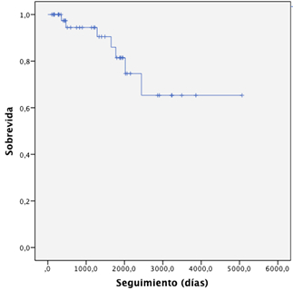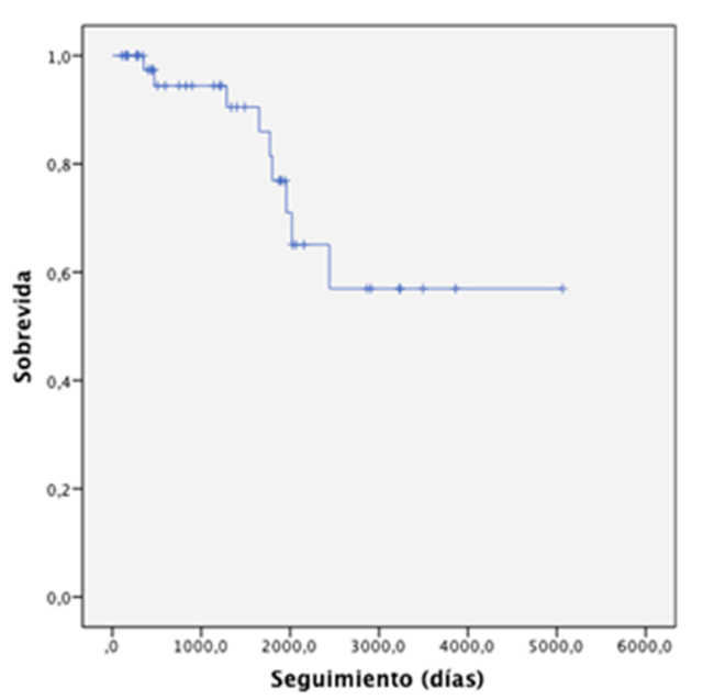 Se incluyeron un total de 49 pacientes, evaluados entre enero de 2015 y enero de 2020, con una mediana de seguimiento para todos los eventos de 1258 días (410-2004), el mínimo fue de 106 días y el máximo de 5006 días.