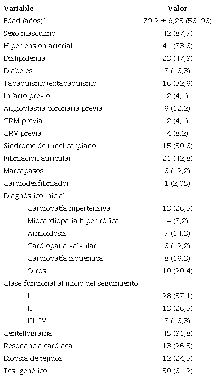 Resultados: La mediana del tiempo de seguimiento fue de 1258 días (410-2004) y la edad promedio de 79 ± 9 años. Al inicio del seguimiento, el 57% de los pacientes estaban en clase funcional I, el 26%, en II y el 16%, en III-IV. El diagnóstico se basó en centellograma con difosfonatos en el 92%; en el 24% requirió biopsia. La mortalidad global fue del 19%, con 15% de muerte cardiovascular. La tasa de internación por insuficiencia cardíaca fue 29%; el 63% de los pacientes empeoró su clase funcional.