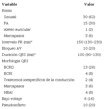 En la evaluación del electrocardiograma, un 62% presentó ritmo predominantemente sinusal (30 pacientes), con PR habitualmente conservado (150 ms; RIC 130-230), y solo un 16% (8 pacientes) cumplía con criterios estrictos de bajo voltaje. (Tabla 2)