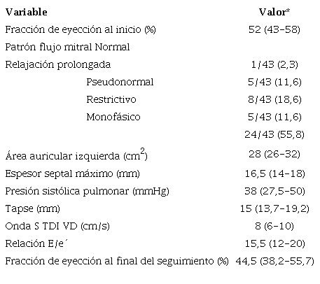 El ecocardiograma mostró una mediana de espesor septal de 16 mm (RIC 14-18), un área auricular de 28 cm2 (RIC 26-32) y una función sistólica predominantemente conservada, con fracción de eyección del 52% (RIC 43-58). (Tabla 3).