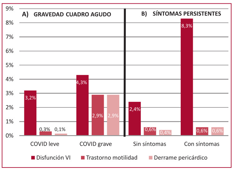 Objetivos: Analizar la prevalencia de injuria cardíaca mediante ecocardiograma luego de la infección por COVID-19 y su asociación con la gravedad del cuadro agudo y con los síntomas persistentes post-COVID. Como objetivo secundario se exploró la relación de la prevalencia de injuria cardíaca con el inicio de la campaña de vacunación contra COVID-19 en la República Argentina.