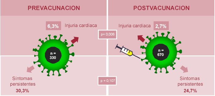 La enfermedad de COVID-19 causada por el coronavirus SARS-CoV-2, séptimo en su tipo capaz de infectar la raza humana, 1 ha producido hasta la fecha más de 6,4 millones de muertes, con alrededor de 586 millones de casos en el mundo. 2 Las manifestaciones clínicas de la infección por COVID-19 abarcan desde síntomas respiratorios leves hasta afectación pulmonar y sistémica grave. 3 Los factores de riesgo cardiovascular, la edad avanzada y las enfermedades preexistentes han demostrado ser predictores de una peor evolución clínica, mayor admisión a unidades de cuidados intensivos (UCI) y mortalidad. 4) (5 A diferencia de otras infecciones virales respiratorias, la enfermedad por COVID-19 genera en su etapa de convalecencia gran incidencia de síntomas persistentes o secuelas, tanto respiratorias como cardíacas, neurológicas, o de otros órganos. 6 Si bien los reportes de prevalencia de este síndrome conocido como Post-COVID o “long COVID” son muy variables, algunas publicaciones reportaron hasta un 90% de síntomas persistentes hasta 6 meses posteriores a la etapa aguda de la infección. (7) El síndrome post-COVID está definido por el CDC como “signos y síntomas que se desarrollan durante o después de una infección por COVID-19, que continúan por más de 4 semanas, y no se explican por otra causa”. 8 Numerosos estudios demostraron su capacidad de producir afección cardiovascular, tanto indirecta como directamente, aunque los mecanismos fisiopatológicos de esta última no son del todo claros. 9 Además de las complicaciones cardiovasculares en la etapa aguda, 10) (11 existe una clara mayor incidencia de injuria cardiovascular en la etapa de convalecencia o post-COVID. 12) (13 Por este motivo, en los últimos dos años las consultas para control post-COVID representaron una porción muy importante de la atención ambulatoria, lo cual obliga al cardiólogo a familiarizarse con esta nueva enfermedad. En un estudio publicado recientemente, nuestro grupo de trabajo demostró una prevalencia de injuria cardíaca post-COVID en nuestro medio del 4,8%. 14 Afortunadamente, desde el inicio de la vacunación masiva para el virus SARS-CoV-2 se ha observado una clara reducción tanto de la mortalidad como de las internaciones en UCI. 15) (16 No obstante, existe muy poca información disponible en la literatura hasta el momento sobre si esta reducción de eventos graves relacionados con la vacunación acompañó una reducción en la prevalencia de daño cardiovascular y de síntomas persistentes en la etapa post-COVID.
