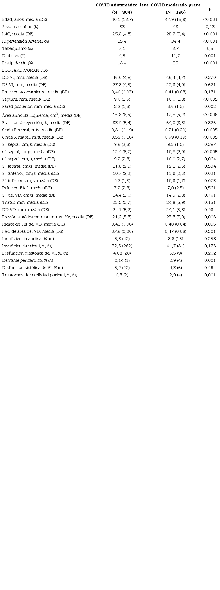 La asociación entre la gravedad del COVID-19 y los hallazgos ecocardiográficos patológicos fue evaluada con análisis multivariado, con ajuste por las variables clínicas que en el análisis univariado mostraron diferencias significativas. Los pacientes con cuadros agudos de COVID-19 asintomáticos o leves fueron agrupados en un grupo, y los pacientes con COVID-19 moderados y graves en otro. No se realizó un análisis multivariado para analizar la asociación entre los síntomas persistentes y los hallazgos ecocardiográficos, ya que no hubo diferencias significativas en las variables ecocardiográficas de interés en el univariado.