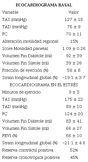 El estudio se realizó de acuerdo con los lineamientos de las guías de práctica clínica sugeridas para la realización de ecocardiografía estrés para valorar cardiopatía isquémica. Se tomaron 4 etapas de imágenes: basal, baja carga (50w), pico de esfuerzo y post esfuerzo inmediato. Las vistas utilizadas fueron las apicales de 4, 3 y 2 cámaras, el eje corto paratesternal a nivel de los músculos papilares y el eje largo paraesternal. La tensión arterial se monitoreó al finalizar cada etapa, y la frecuencia cardíaca de manera continua. Como criterios para terminar la prueba se utilizaron: agotamiento muscular, el haber alcanzado la máxima FC prevista para la edad, la presencia de ángor o disnea significativa, cambios de relevancia en el segmento ST (infradesnivel ST ≥4 mm o supradesnivel ST >1 mm), hipertensión arterial (tensión arterial sistólica, TAS, ≥240 mmHg y/o diastólica, TAD, ≥120 mmHg) o arritmias graves. Para la valoración del score de motilidad parietal se utilizó el modelo de 17 segmentos, otorgando 1 punto a la motilidad normal, 2 a la hipoquinesia, 3 a la aquinesia y 4 a la disquinesia. Se consideró eco estrés negativo para isquemia miocárdica cuando el score de motilidad parietal en el apremio no era mayor que el de reposo. 6