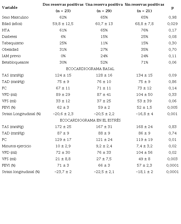 Material y métodos: Estudio retrospectivo realizado sobre 73 pacientes con EE con ejercicio, sin isquemia. De acuerdo con la presencia o ausencia de RCon y RCro se los dividió en tres grupos. Grupo 1: presencia de ambas reservas; grupo 2: presencia de solo una reserva y grupo 3: ausencia de ambas reservas. La RCon se determinó mediante el cociente entre la tensión arterial sistólica y el volumen de fin de sístole tanto en reposo como en estrés (Valor normal: > 2) y la RCro se definió como el aumento mayor al 80% de la frecuencia cardíaca basal.
