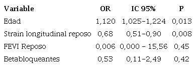 Se realizó una regresión logística binaria con aquellas variables asociadas a la ausencia de RCon y RCro. La edad (OR 1,12, IC95% 1,02-1,22; p = 0,01) y el valor de SLG en reposo (OR 0,68, IC95% 0,51-0,90; p = 0,008) fueron las variables asociadas en forma independiente a la ausencia de ambas reservas (Tabla 4).