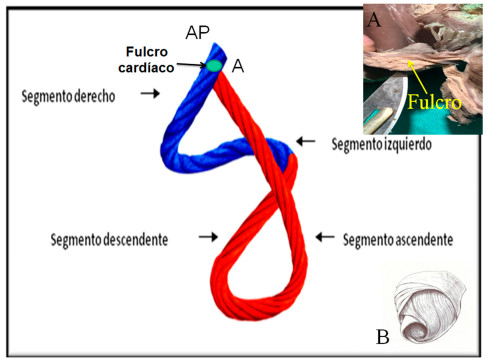 Esta hélice anátomo-funcional se halla constituida, en sus cámaras ventriculares, 6 por dos bandeletas denominadas descendente y ascendente. La primera incluye los segmentos derecho, izquierdo y descendente; mientras que la segunda queda conformada por el segmento restante, el ascendente (Figura 2). De este modo la estructura muscular miocárdica describe dos vueltas en espiral con inserción de sus extremos inicial y terminal en un núcleo cuya estructura es ósea, condroide o tendinosa, de acuerdo con los diferentes especímenes animales y humanos estudiados en nuestras investigaciones. Al mismo lo hemos denominado fulcro cardíaco (Figura 2). 7 Esta inserción es el único sitio perceptible de donde se originan y terminan las fibras miocárdicas.