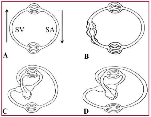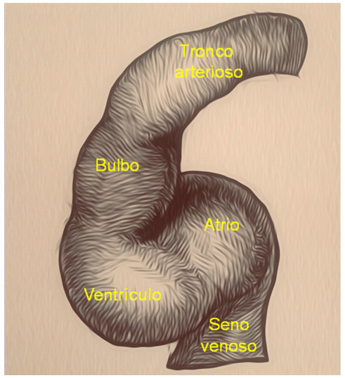 La torsión del tubo circulatorio sobre sí mismo, en un segmento del semicírculo arterial (circuito sistémico), constituye un paso trascendental en el desarrollo evolutivo de las especies (Figura 3 C). Tras este bucle se van a conformar las cámaras ventriculares futuras, morfología que se comprende bien al desplegar la continuidad muscular que ostenta el miocardio. 4
