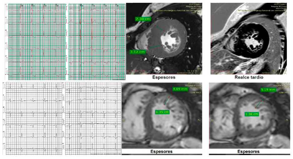El caso índice es una mujer con hipertrofia severa diagnosticada a los 37 años, con implante de CDI por taquicardia ventricular (TV) monomorfa sostenida sincopal a los 47 años. La CRM que evidenció Miocardio no compacto (MNC) y G+ (MYH7: c.1208G>A (p. Arg403Gln). Sus 3 hijos presentan G+, dos de ellos con F+, ECG patológico (hipertrofia ventricular izquierda y ondas T negativas en la cara anterolateral) ECG y CRM de uno de sus hijos arriba y de la paciente abajo.