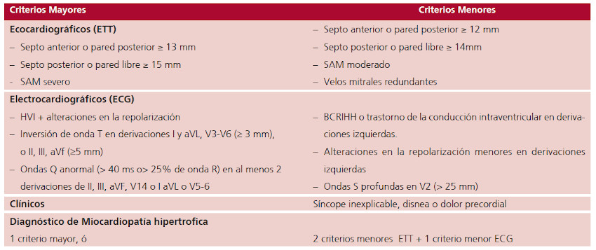 Cuadro modificado de McKenna WJ, Spirito P, Desnos M, Dubourg O, Komajda M. Experience from clinical genetics in hypertrophic cardiomyopathy: proposal for new diagnostic criteria in adult members of affected families. Heart 1997;77(2):130-132