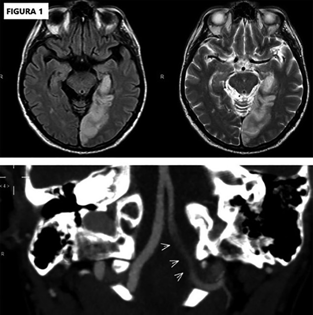 Se presenta un varón de 59 años, extabaquista (40 pack/year), hipertenso y dislipidémico, que presentó un trastorno de la marcha de 2 semanas de evolución y relató un registro de hipotensión arterial en el miembro superior izquierdo. En consulta con su médico laboral se constató afasia de expresión, hemianopsia temporal derecha e inestabilidad de la marcha, y se decidió su internación. En el electrocardiograma se constató ritmo sinusal; en el ecocardiograma, función sistólica ventricular izquierda conservada, sin shunt intracavitario ni trombos intraluminales. En el eco Doppler de vasos de cuello: ateromas subintimales carotídeos sin hallazgos hemodinámicamente significativos, con flujo de muy baja velocidad en la arteria vertebral izquierda. La tomografía axial computada (TAC) de cerebro reveló áreas hipodensas en la sustancia blanca bifrontoparietales. La angioresonancia magnética nuclear de cerebro evidenció una lesión isquémica aguda temporo-occipital izquierda en territorio de la arteria cerebral posterior izquierda, con ausencia de flujo en el segmento intracraneal de la arterial vertebral. (Figura 1)