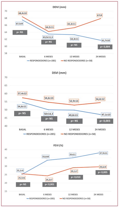 A los 6 meses y 12 meses no hubo diferencias significativas en cuanto a los diámetros ventriculares, pero sí, lógicamente en la FEVI (p<0,001), ya que el aumento de la misma era uno de los criterios para definir respuesta al tratamiento. A los 24 meses hubo diferencias en el grupo de pacientes respondedores; fueron significativamente menores el DDVI (p=0,004) y el DSVI (p=0,003) y mayor la FEVI (p < 0,001). (Figura 1)
