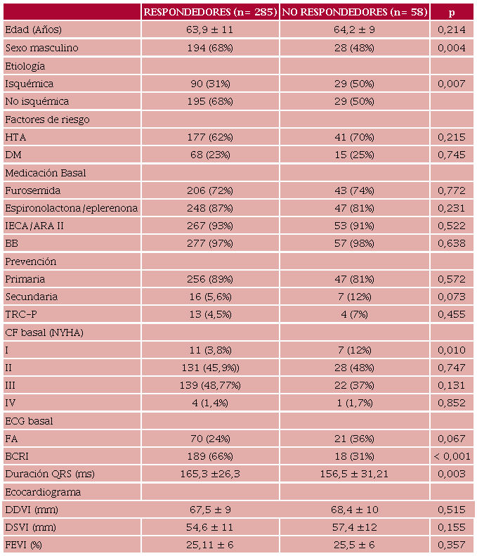 De los 343 pacientes evaluados, 58 (17 %) fueron no respondedores y 285 (83 %) respondedores. Las características basales de la población se encuentran en la Tabla 1; la edad promedio de implante fue de 64 años, el porcentaje de mujeres en el grupo de no respondedores fue mayor. El 68% de los pacientes respondedores tenía etiología no isquémica, mientras que en el grupo no respondedores ello ocurrió en el 50 %. No hubo diferencias significativas entre los grupos en cuanto a factores de riesgo cardiovascular, ni en el ecocardiograma basal. La mayoría de los pacientes estaba en clase funcional NYHA I o II. Hubo sí diferencias en el electrocardiograma (ECG) basal: en el grupo de no respondedores solo el 31 % tenía bloqueo completo de rama izquierda (BCRI), vs. el 66 % de los respondedores. La duración del QRS basal fue menor en el grupo no respondedor.