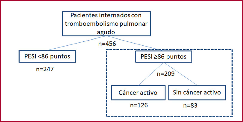 Objetivos: Determinar si, en pacientes con TEP y un puntaje PESI ≥86 puntos, la presencia de cáncer activo se asocia a una evolución desfavorable respecto de aquellos sin cáncer.