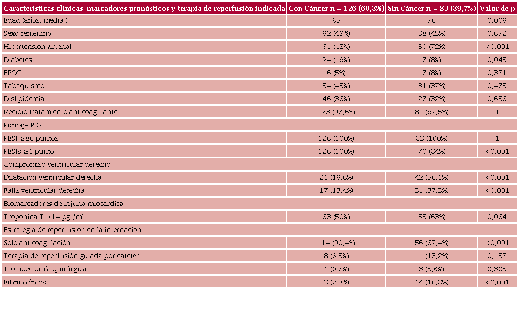 Resultados: Se analizaron 209 pacientes. La población con cáncer, respecto de aquella sin cáncer, resultó ser más joven (65 vs. 70 años; p=0,006), presentó valores de PESI simplificado altos con mayor frecuencia (100 % vs. 84 %; p<0,001), tuvo menor requerimiento de ARM (9 % vs. 34 %; p=0,005) y menor uso de DV (11 % vs. 23 %; p=0,019), aunque no se observaron dife rencias en las tasas de MIH (12,7 % vs. 8 %; p=NS).
