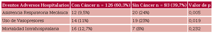 Material y métodos: Análisis retrospectivo en pacientes con TEP y un puntaje PESI ≥86, entre los años 2008 y 2022. Se evaluó la ocurrencia de muerte intrahospitalaria (MIH), uso de drogas vasopresoras (DV) y necesidad de asistencia respiratoria mecánica (ARM) en los pacientes con vs. sin cáncer.