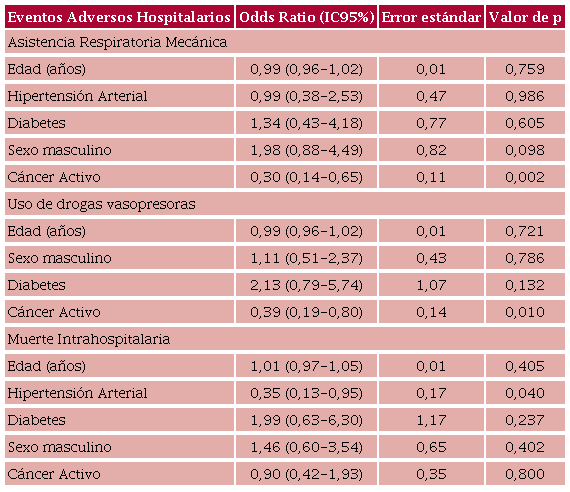 Conclusiones: Los pacientes con TEP y un puntaje PESI ≥86 con cáncer no presentaron mayor MIH e incluso tuvieron menor requerimiento de ARM y DV. En la población estudiada, los pacientes con TEP y cáncer no tuvieron mayor riesgo de presentar una evolución desfavorable.